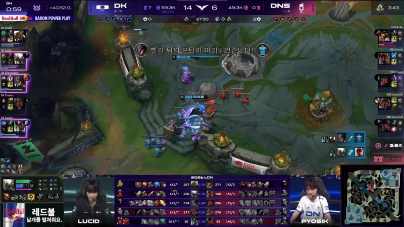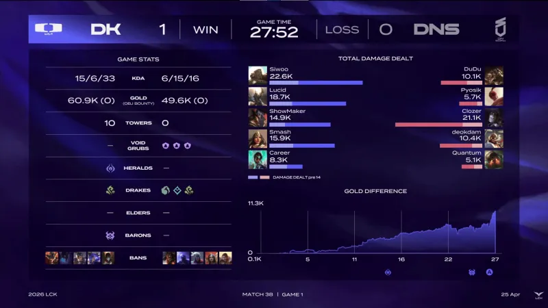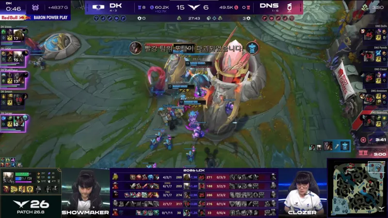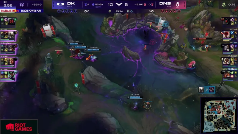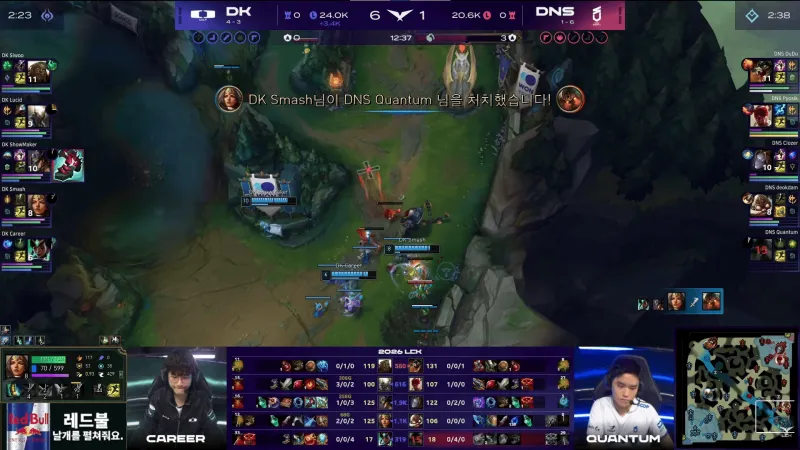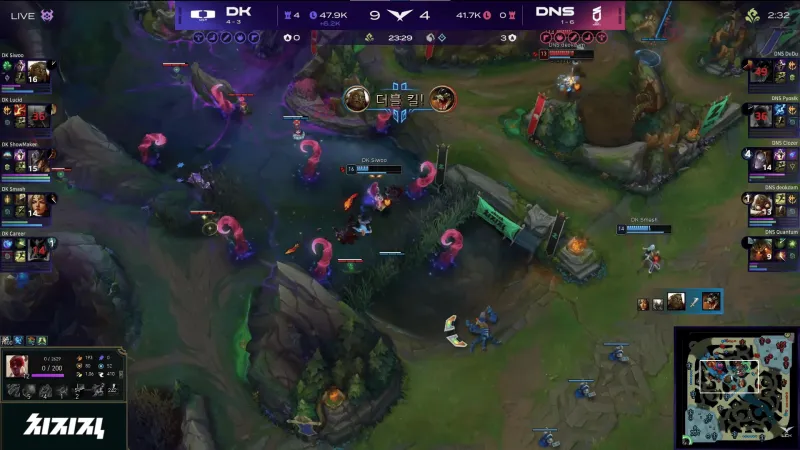 比赛第23分钟,ShowMaker卡牌被抓后DNS开打大龙,Siwoo俄洛伊打五个拿到双杀帮助DK守住大龙。